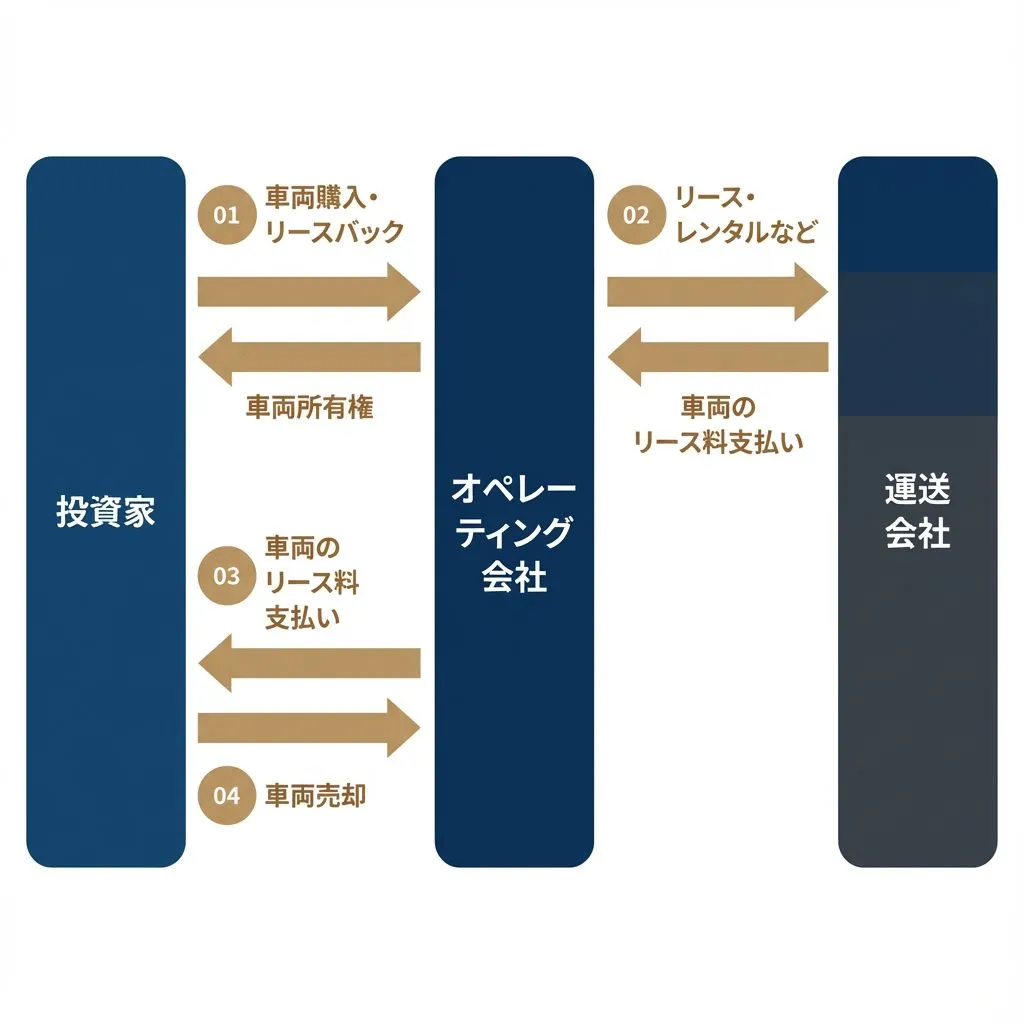 ④分配・売却:リース料収入を投資家に分配し、リース期間終了後に車両を売却して出資金を返還